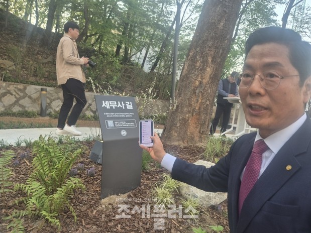 | ▲구재이 한국세무사회장이 세무사길 표지판에서 직접 큐알코드를 찍어가며 세무사길에 대해 소개하는 모습. |