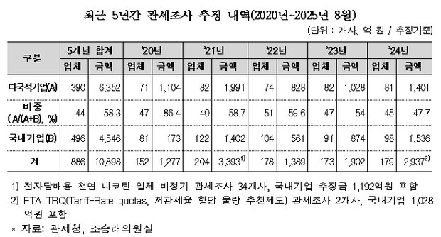 국회 기획재정위원회 조승래 의원(더불어민주당)이 관세청으로부터 제출받은 자료에 따르면, 최근 5년간(2020~2024년) 관세청이 관세조사를 통해 세금을 추징한 전체 기업 수는 886개사, 추징액은 총 1조 898억 원으로 집계됐다.