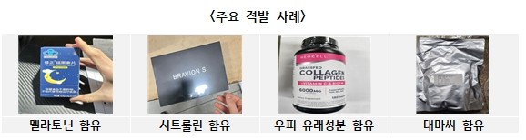 적발된 성분 중에는, 최근 건강에 대한 높은 관심도를 반영하듯 식품의약품안전처 지정 국내 반입 차단 성분인 멜라토닌(수면유도), 우피 유래성분(콜라겐 등 피부·관절효능 성분), 시트룰린(운동능력 향상)을 함유한 경우가 많았다.