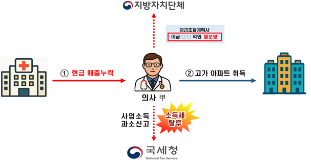 - 조사 결과, 비급여 진료비를 현금 결제하도록 유도하고 사업용 계좌가 아닌 개인 계좌에 입금하는 방법으로 ○○억 원을 수입금액 누락하였으며, 탈루한 자금으로 고가 아파트를 취득한 사실을 확인함