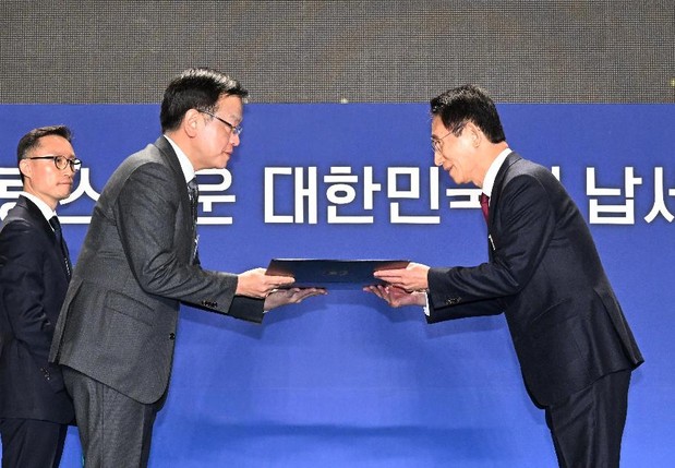 | ▲3월 4일 열린 제58회 납세자의 날 기념식에서 최상목 부총리 겸 기획재정부 장관이 (주)동서 김종원 대표이사에게 금탑산업훈장을 수여하고 있다.[사진=기획재정부] |