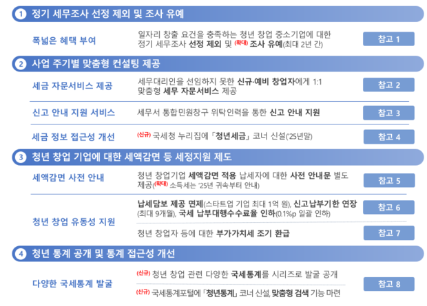 먼저, 일자리 창출 요건을 충족하는 청년 창업 중소기업에 대해서는 정기 세무조사 선정제외 및 최대 2년간 세무조사를 유예하고, 사업 주기별 맞춤형 세무컨설팅을 제공하고 있다.
