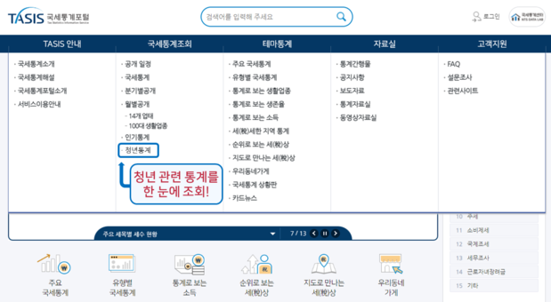 ○ 국세통계포털(TASIS)에서 청년 관련 통계를 쉽고 편리하게 조회할 수 있도록 청년통계 코너 신설, 포털 화면 구성 변경을 통해 접근성 강화