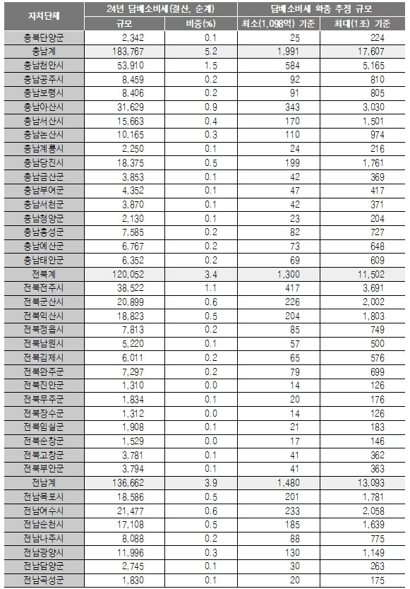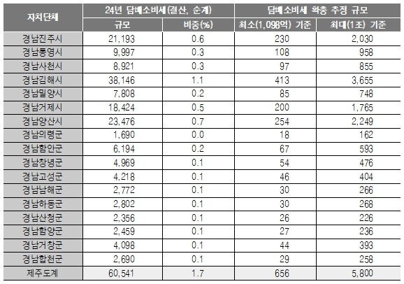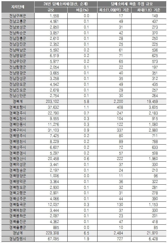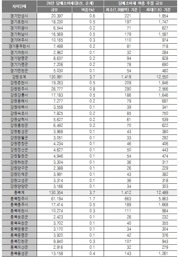 이를 기준으로 한국지방세연구원은 2024년 전국 지방자치단체 담배소비세 비중에 따라 각 개별 시·군(특·광역시)의 담배소비세 확충 규모도 동시에 추정했다.
