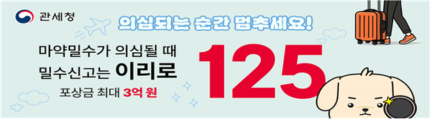 <마약 신고 핫라인> ➀마약 밀수신고 이리로 125(해외전화 시 +82-2-3438-5199) ➁24시 익명 마약류전화상담센터 1342(해외전화 시 +82-1342) |