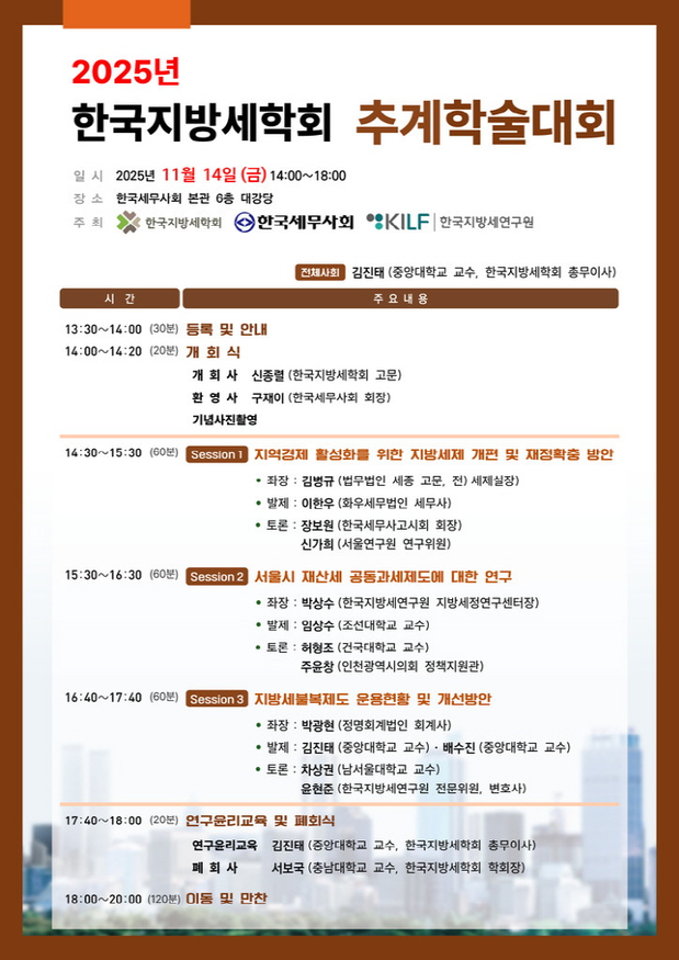 이번 학술대회의는 총 3대 세션으로 진행되며, 첫번째 세션은 김병규 법무법인 세종 고문(전 세제실장)이 좌장을 맡아 이한우 화우세무법인 세무사의 ‘지역경제 활성화를 위한 지방세제 개편 및 재정학충 방안’에 대한 발제에 대해 장보원 한국세무사고시회장, 전병욱 서울시립대 교수가 토론을 벌인다.
