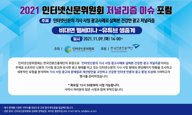 코로나 방역 상황을 감안, 14:00–16:00까지 유튜브로 생중계되는 이번 포럼은 2021년 문제되는 광고의 대표적인 사례로 지적받고 있는 오프라인 신문의 기사형 광고와 유사한 형태를 띠고 있는 '인터넷신문의 기사 사칭 형태의 랜딩페이지' 현황을 조사하고 세부적인 유형을 분석하여 기사 사칭 광고의 문제점과 개선방안을 고민하고 건강한 인터넷 언론의 광고 환경 조성에 기여하기 위해 준비된 것이다. 시청은 9일 13시 50분부터 가능하다.