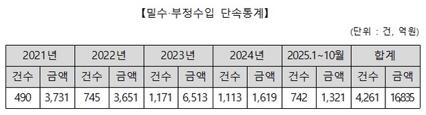 실제로 최근 5년간 총 4,261건, 1조 6,835억원 규모의 밀수·부정수입 행위가 관세청에 적발됐는데, 이는 국민·산업 안전 등과 관련된 품목을 수입하면서 세관 신고를 회피하거나, 법령에 따른 절차 및 요건을 갖추지 않고 불법으로 반입한 사례들이었다.