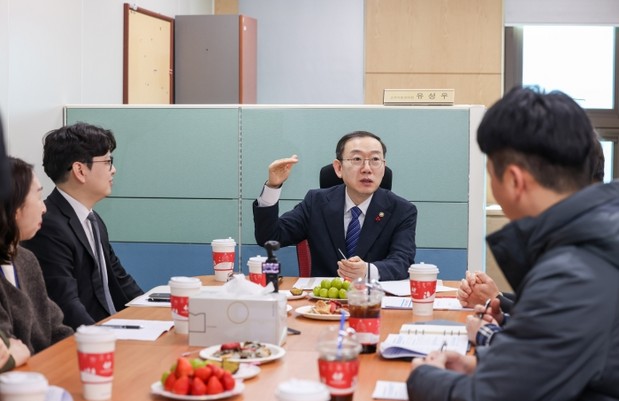 | ▲이명구 관세청장(가운데)이 29일 정부과천청사에 소재한 관세청 고객지원센터(콜센터)를 방문해 내일부터 시행하는 ‘챗봇 관세상담 서비스’와 관련해 이야기를 나누고 있다. |