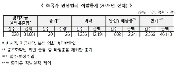 한편, 관세청은 2025년 한 해 동안 초국가 민생범죄 총 2,366건, 4조 6,113억원 규모와 불법 총기 26정을 적발했다.