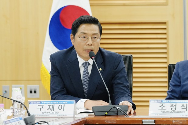 ▲ '취득세 성실신고확인제 도입’ 토론회에서 인사말을 하고 있는 한국세무사회 구재이 회장 |
