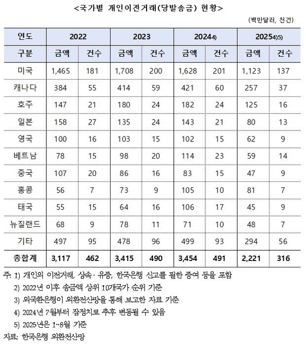 송금 국가별로는 미국이 1조5961억 원(13만7천건)으로 가장 많았고, 캐나다 3651억 원(3만7천건), 호주 1776억 원(1만6천건), 일본 1136억 원(1만3천건) 순이었다.