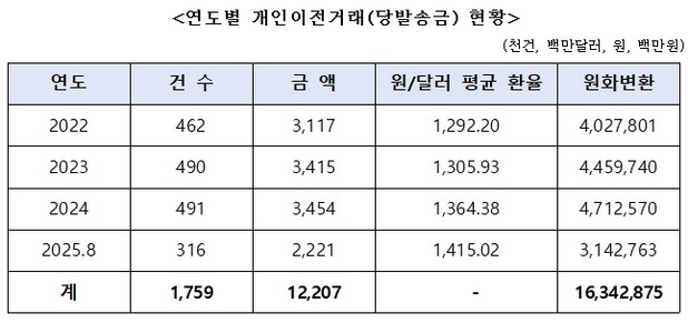 연도별 송금 건수는 2022년 46만2천건에서 2023년 49만건, 2024년 49만1천건으로 매년 증가추세다. 올해는 8월까지 31만6천건을 기록했다.