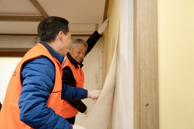 | ▲삼천리 전영택 사장이 `제17회 도시가스업계 봉사의 날`을 맞아 27일 안양의 집 생활관 벽지를 도배하고 있다 |