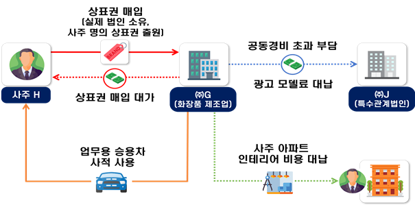 〇상표권 가공거래, 특수관계법인 부당 지원, 사주의 사적 비용을 회사 경비로 대신 부담한 ㈜G에 대해 강도 높은 세무조사 실시