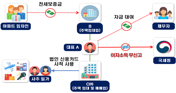 [주요 탈루사례1]전세금을 타인에게 대여하며 이자소득 무신고, 사적경비를 주택임대업 법인 비용으로 처리한 서울 아파트 5호 이상 임대업자 |