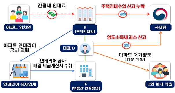 -임대업자 D는 거래 상대방인 임차인이 사업자가 아닌, 일반인이라는 점을 악용하여 주택 40여 호에 대한 임대수입 0억 원을 신고 누락