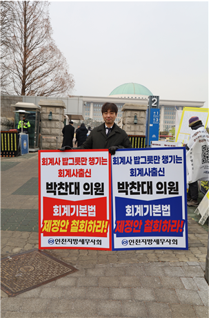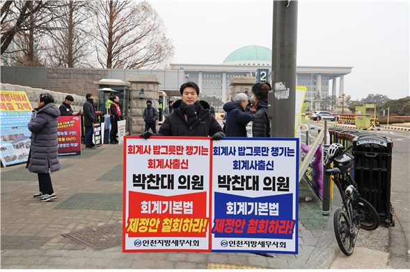 2월 10일, 인천지방세무사회 소속 세무사들이 국회 정문 앞에서 박찬대 의원(더불어민주당, 인천 연수구갑)이 발의한 ‘회계기본법’ 제정안의 즉각 철회를 요구하는 1인 시위를 전개했다.