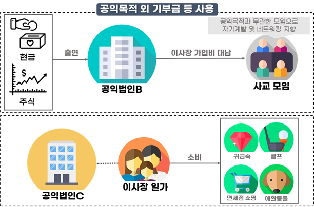 ○공익법인 B는 공익목적보다는 사교 목적으로 운영되는 모임의 수백만원 상당 가입비를 이사장 사비 대신 기부금 등 공익법인 자금으로 대납