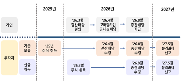 □고배당 분리과세 혜택은 2026년에 지급받은 배당소득을 신고하는 2027년 5월 종합소득세 신고부터, 2029년에 지급받은 배당소득을 신고하는 2030년 5월 종합소득세 신고까지 한시적으로 적용된다.