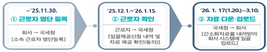 회사는 매년 연말정산 대상 근로자 전체 명단을 홈택스에 등록해야 하며 등록 이후 ’26.1.10.(토)까지 홈택스에서 추가・제외가 가능하다. →신규입사자만 등록하거나 일용근로자를 포함하여 등록하지 않도록 주의 |