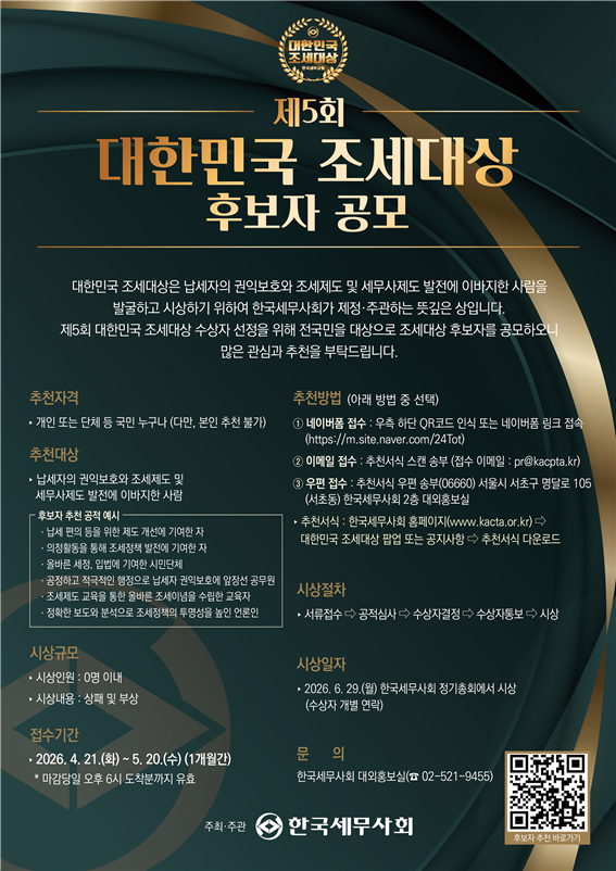 한국세무사회(회장 구재이)는 4월 21일부터 5월 20일까지 한 달간 전 국민을 대상으로 ‘제5회 대한민국 조세대상’ 후보자를 공개 추천받는다고 밝혔다.