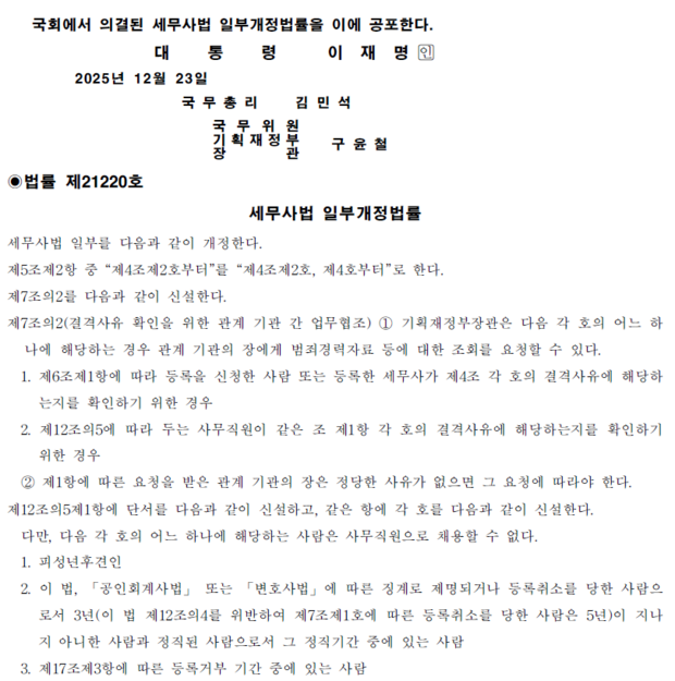 | ▲법률 제21220호 세무사법 일부개정법률(2025.12.23. 전자관보) |