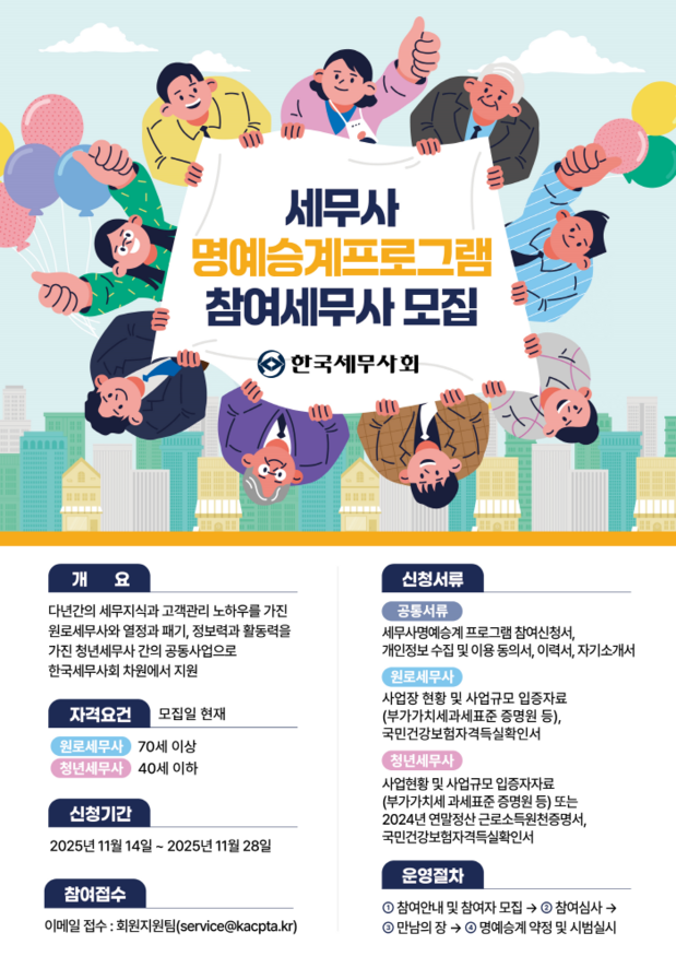 ‘세무사 명예승계 프로그램’의 신청기간은 11월 14일부터 28일이며, 세무사회가 제공하는 소정서식과 구비서류를 이메일(service@kacpta.kr)로 제출하면 된다.