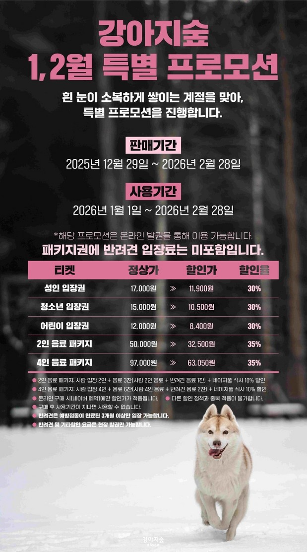 이번 프로모션은 강아지숲을 찾는 방문객들이 보다 합리적인 가격으로 겨울철 강아지숲의 다양한 시설을 이용하며 매력을 만끽할 수 있도록 기획됐다.