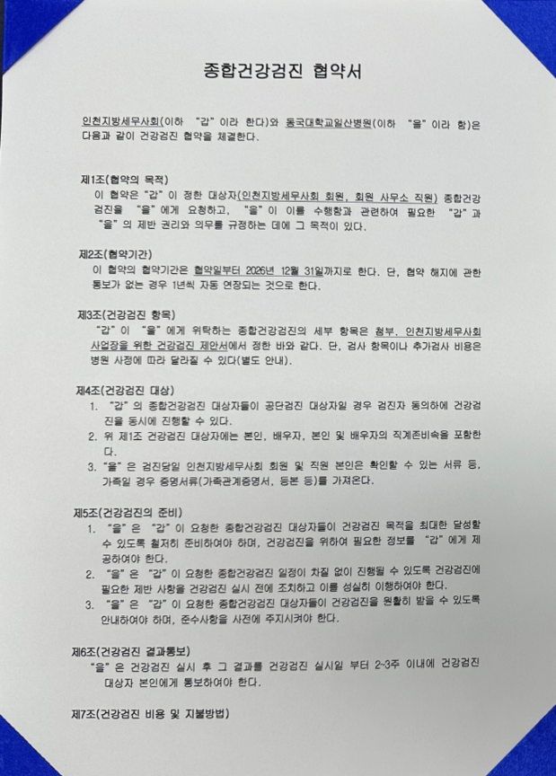 | ▲인천지방세무사회와 동국대학교일산병원과의 업무협약서[인천지방세무사회 제공] |