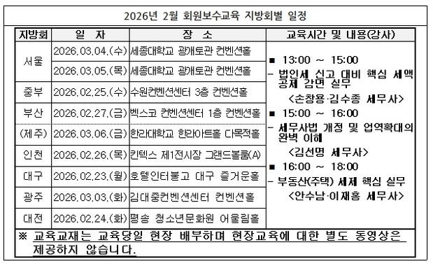 한국세무사회는 2026년 2월 회원보수교육 중 현장 집합교육을 오는 2월 23일부터 다음달 6일까지 지방회별로 순차적으로 실시한다.
