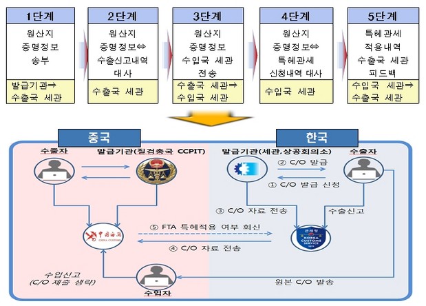| ▲ 한국과 중국간 운영되고 있는 e-C/O 교환시스템의 처리 절차 |