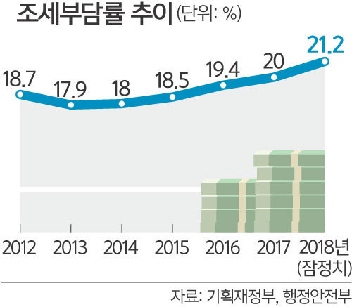 21일 기획재정부와 행정안전부, 한국은행 등에 따르면 지난해 조세 수입은 총 377조 9000억원으로 1년 전보다 9.3%(32조 1000억원) 증가했다. 경상 국내총생산(GDP·지난해 1782조 2689억원) 대비 국세와 지방세의 비율인 조세부담률은 21.2%로 1년 전보다 1.2% 포인트 상승했다. 이러한 상승폭은 2000년(1.6% 포인트) 이후 최대다.