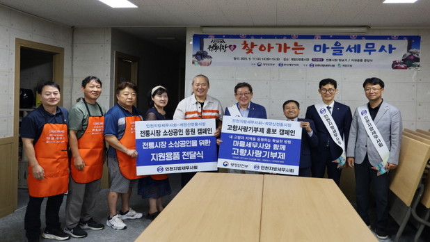 인천지방세무사회(회장 최병곤)는 지난 17일 추석을 맞아 인천 계양산전통시장을 방문해 소상공인 지원용품(장바구니, 앞치마)을 전달하고 전통시장 장보기 행사를 진행했다.