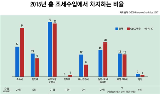 총 세수에서 17%를 차지한 소득세 세수 68조원은 OECD 평균인 24%보다 낮고 총 세수의 15%인 부가가치세 60조2천억원 역시 OECD 평균인 20%보다 낮았다.