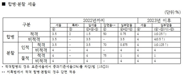 2023년 합병·분할에 대해 그동안 취득의 원인이 유상인지 무상인지 그에 따른 세율과 과세표준에 대한 개정이 있었다. 합병·분할로 취득하는 경우 상대방 법인(또는 주주)에게 주식이 제공되는 등 대가관계에 있는 점을 감안 일괄 유상취득 세율을 적용하도록 하였다.