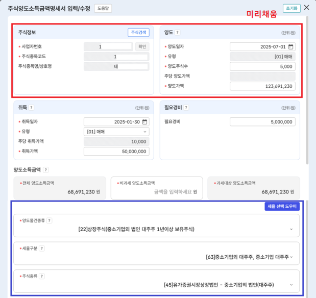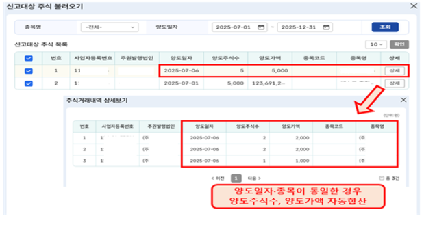 양도 일자와 종목이 동일한 경우, 신설된 양도내역 복수 선택 기능을 통해 선택된 양도주식수・양도가액이 자동으로 합산되어 미리채움 서비스로 제공