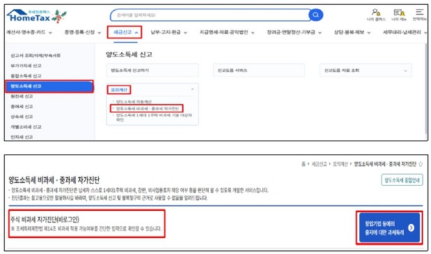 비과세 자가진단 서비스는 주식 양도소득이 창업기업 등에의 출자에 대한 과세특례 비과세 요건에 해당하는지를 납세자가 신고 전 간편하게 확인할 수 있도록 하기 위한 것으로, 자가진단 결과는 참고용이며 납세자는 법령에 따라 최종 신고 여부를 결정해야 한다.