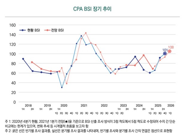 조사 결과 올해 4분기 경제 현황 BSI는 101, 2026년 1분기 전망 BSI는 108을 기록했다.