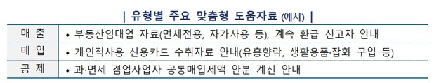 또한, 내·외부 자료, 과세기반자료(전자세금계산서·신용카드·현금영수증) 등을 분석해 업종별 특성에 따른 맞춤형 도움자료를 123만 사업자에게 추가로 제공한다.