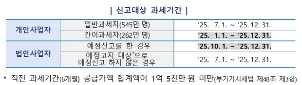 신고대상 과세기간은 개인 일반과세자의 경우 지난해 7월 1일부터 12월 31일까지이며, 간이과세자는 작년 1월 1일부터 12월 31일까지이다. 하지만 법인사업자는 예정고지 대상 여부에 따라 기간이 다르니 유의해야 한다.