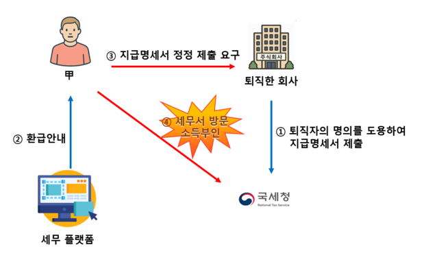 ○ 甲은 세무 플랫폼에서 환급받을 세금이 있으니 신청하라는 안내를 받아 세부내역을 조회하였고 20XX년까지 근무한 회사로부터 사업소득 ○백만원 지급명세서가 제출된 것을 발견- 퇴사한지 수년이 지난 업체 대표에게 연락하니 잘못 신고한 것을 정정하겠다고 대답하였으나 이후 아무런 조치를 취하지 않음