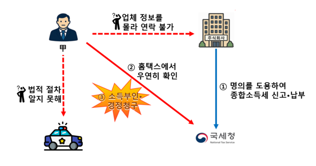 ○ 甲은 홈택스에서 1천만 원 정도의 인적용역 사업소득을 지급받은 것으로 소득 지급명세서가 제출되어 있고 종합소득세 신고 · 납부까지 되어있는 사실을 발견○ 지급명세서를 제출한 업체 정보를 몰라 연락할 방법도 없고 법적인 절차도 알지 못해 어떻게 대처해야 할지 막막한 상황