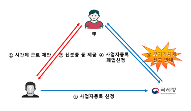 사례 3 [사업자등록] | 근로계약서 작성을 미끼로 신분증을 요구하고 이를 이용해 사업자등록을 신청하여 매출 발생...부가가치세 신고 안내까지 받아 |