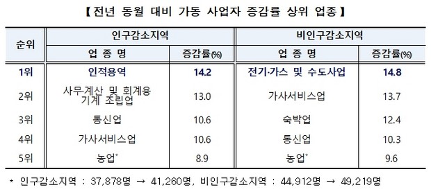 반면, 비인구감소지역의 경우 전기·가스 및 수도사업, 가사서비스업, 숙박업 순으로 높았습니다.