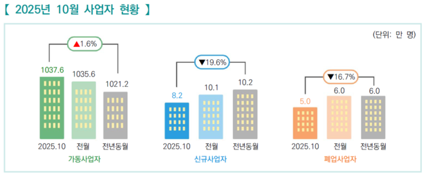 □ 2025년 10월 가동 사업자는 1,037.6만 명으로 전년 동월 1,021.2만 명 대비 16.4만 명(1.6%) 증가하였습니다.