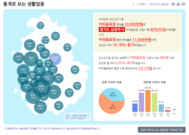 경기도 남양주시에서 커피음료점 연매출 10,000만 원은 상위 40% 이내에 해당하며 평균 연매출은 1억 1,836만 원으로 전년 대비 10.18% 증가, 사업자 수는 982명, 평균 사업존속연수는 3년 5개월 등의 정보를 알 수 있습니다.