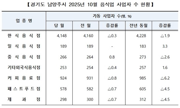 국세청 월간 지역 경제지표 2025년 10월 지역별 생활업종 사업자 현황을 보면 특정 지역의 생활업종 사업자 수와 전년, 전년 동월 증감 현황을 알 수 있습니다.