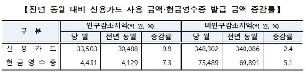 신용카드 사용 금액 및 현금영수증 발급 금액은 인구감소지역에서 전년 동월 대비 더 많이 증가한 것으로 나타납니다.