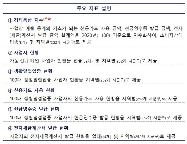 국세청에 따르면, 그동안 실물경제를 쉽게 이해할 수 있도록 내수 경제지표와 밀접한 사업자 개·폐업 현황과 대표적인 소비지표인 신용카드 소비 현황 등의 경제지표를 관련 부처 및 지방자치단체에 매월 제공해 왔다.